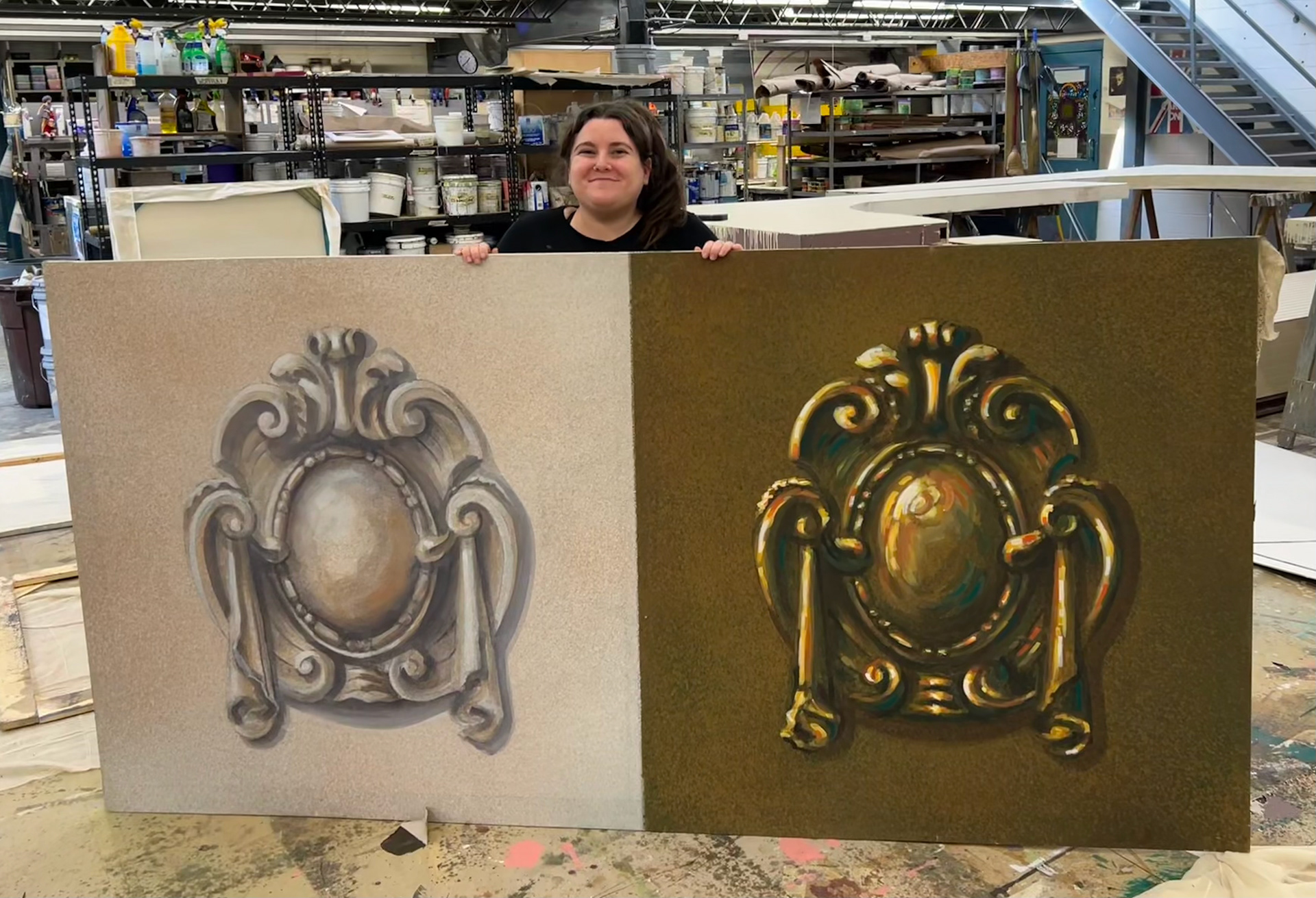 2 4'x4' painted cartouches, based on reference images of matte marble and reflective bronze