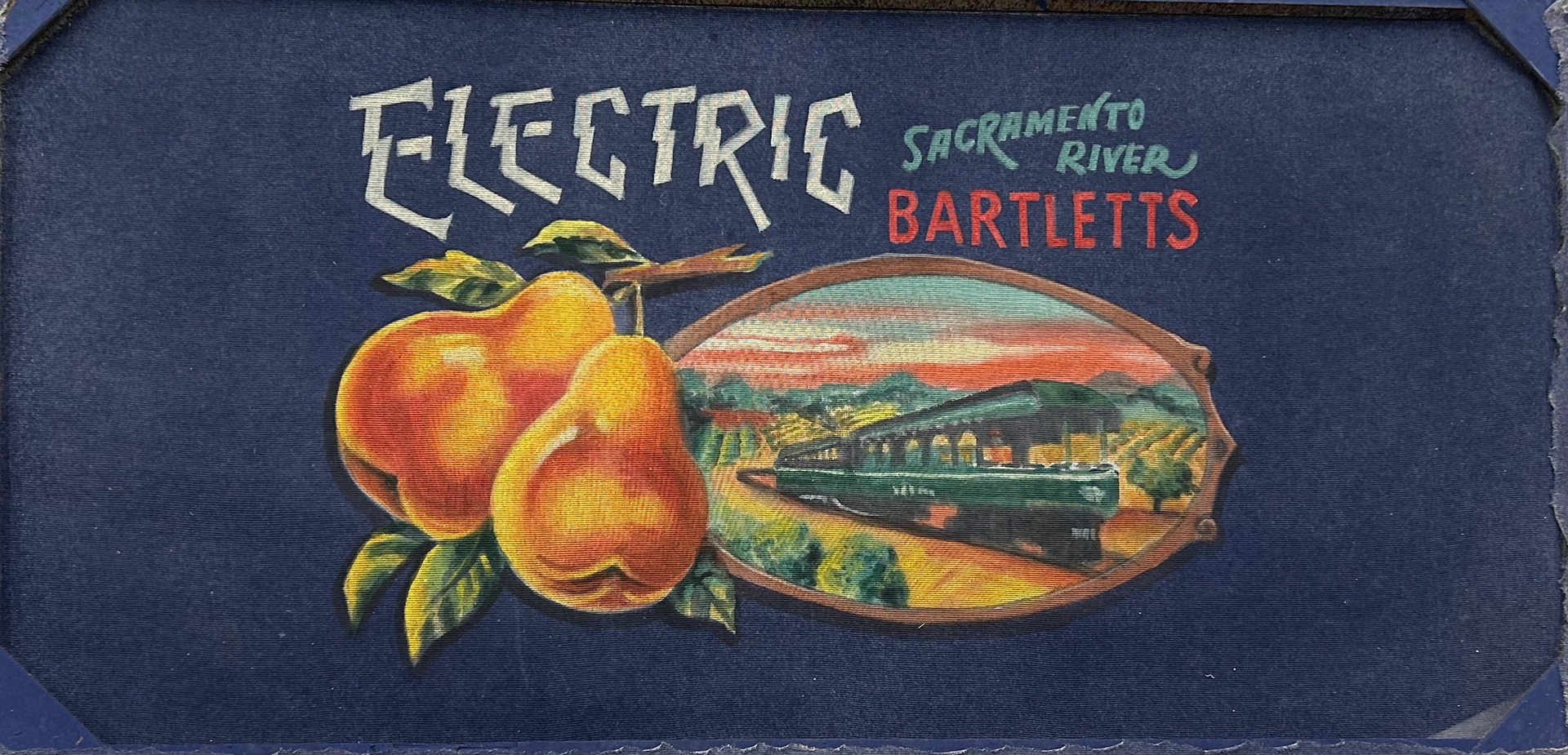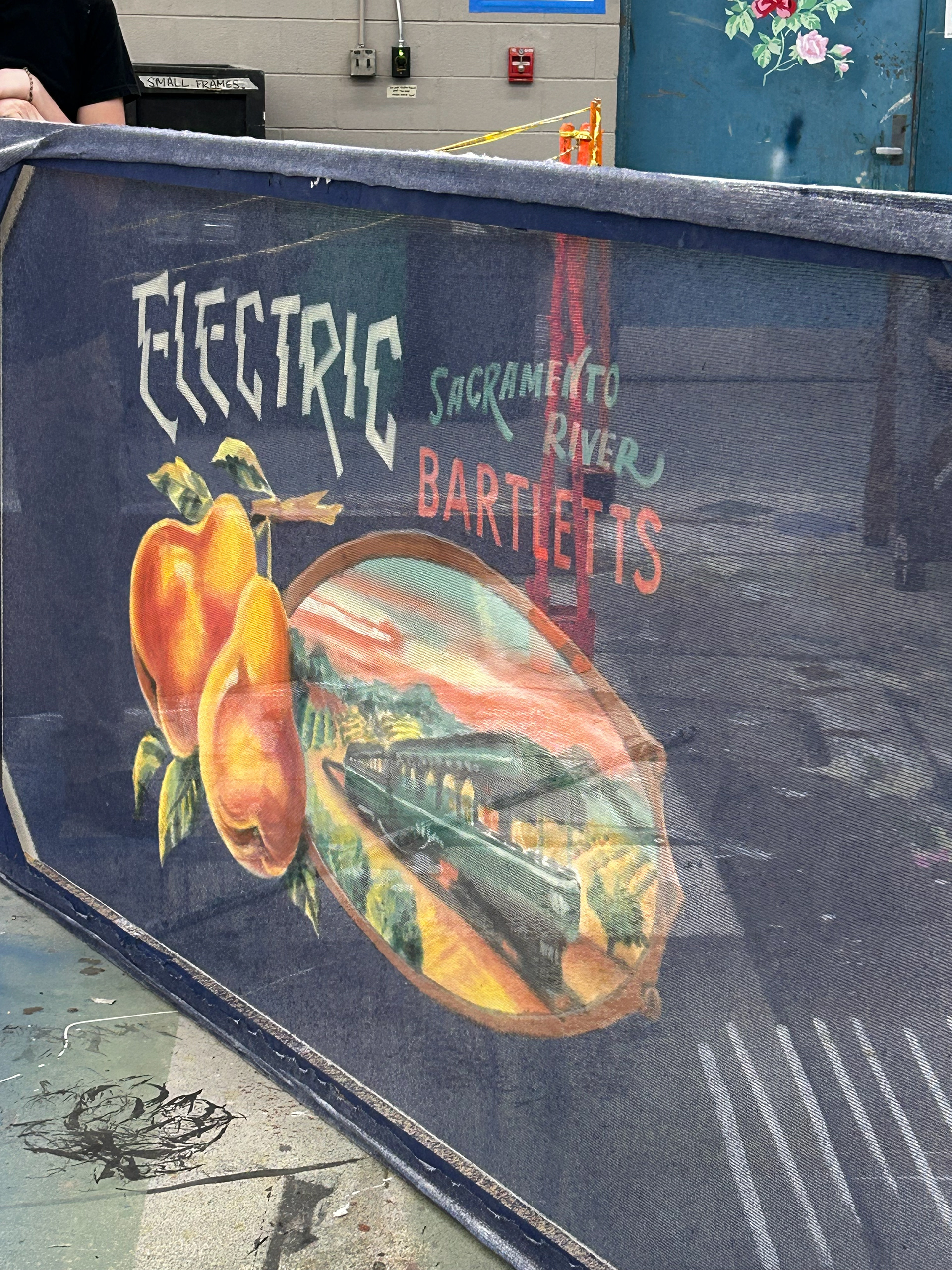 8'x8' fruit box label painted on white sharkstooth scrim